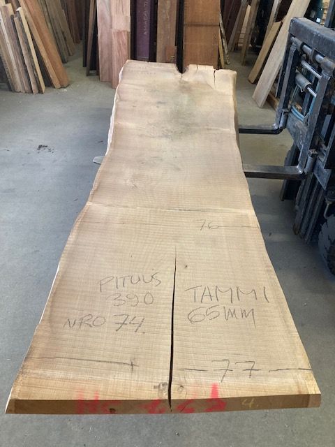 Tuotetiedot: Tammilankku, noin 3600 x 800 x 65 mm, konekuivattu, eurooppalainen tammi, luonnon reuna, halkeineisuutta, oksia, haara. Saat kuvissa olevan lankun.